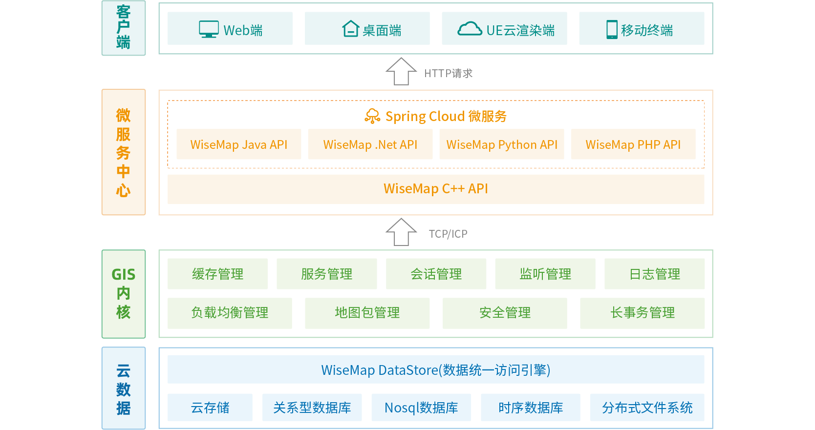 平臺研發(fā)以C++語言為主導(dǎo),以Spring Cloud微服務(wù)框架為中心,以自研延遲渲染框架為支撐,融合了分布式存儲、計算,超大規(guī)模二三維數(shù)據(jù)顯示、設(shè)計、格式交換等技術(shù),可通過WiseMap Desktop、WiseMap Server、WiseMap Web、WiseMap UE、WiseMap API、WiseMap插件等功能模塊對數(shù)據(jù)進(jìn)行處理、存儲、管理、發(fā)布、展示和分析等操作,功能完備強(qiáng)大。